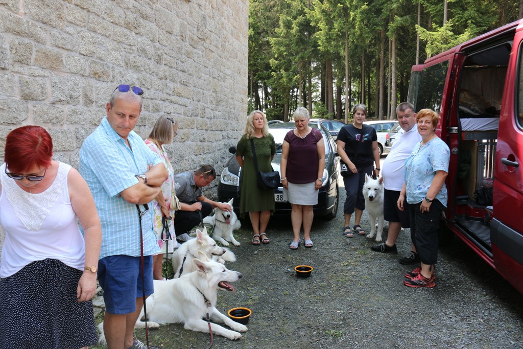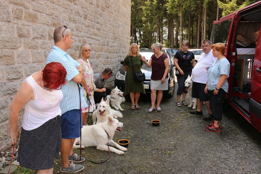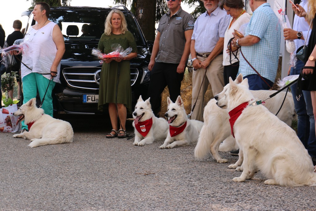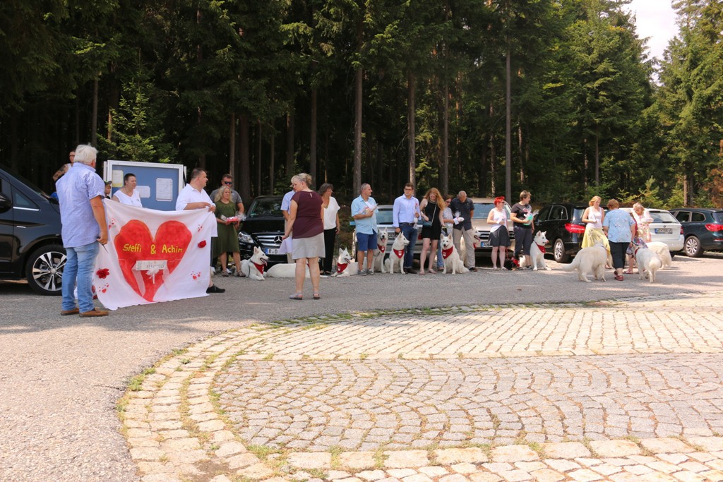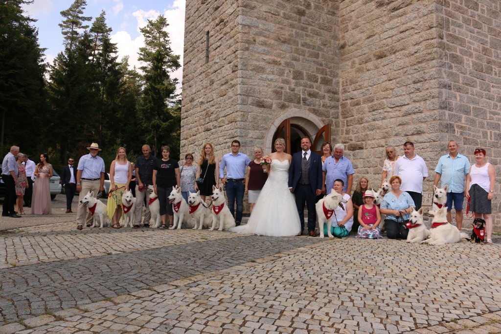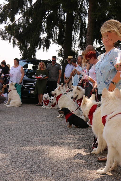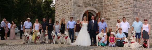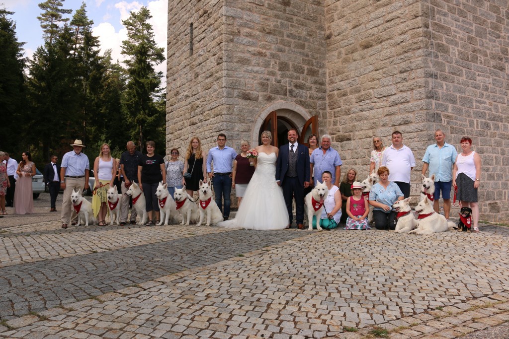 als sich am Samstag, den 4. August 2018 unsere Zwei, Steffi und Achim, das JA- Wort gaben. Sie hatten sich dazu die Steinwald-Kirche in Erbendorf ausgesucht, idyllisch auf einer Anhöhe im Wald gelegen. 17 Leinenführer und 14 Weiße Schweizer Schäferhunde und ein lieber Dackel ( welcher sich übrigens unter den „Weißen“ total wohl gefühlt hat )haben sich eingefunden.
