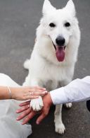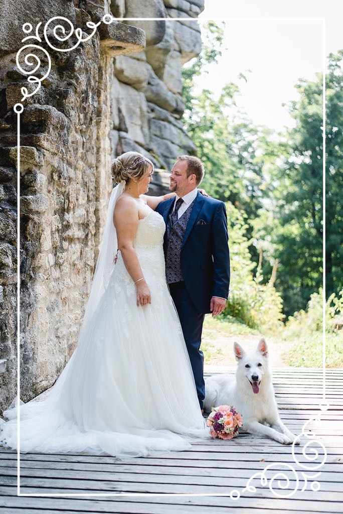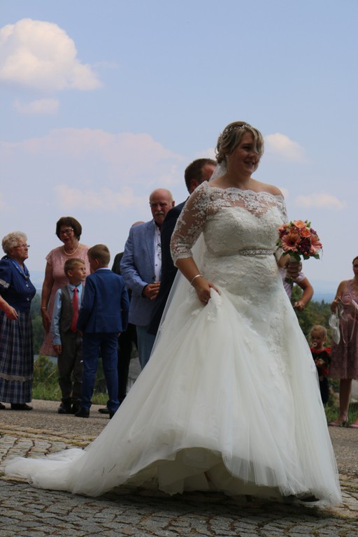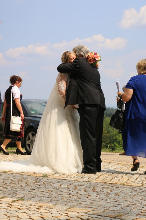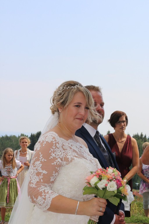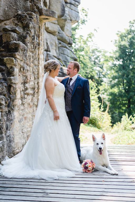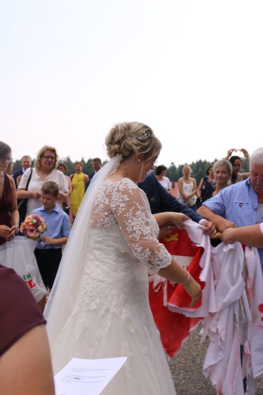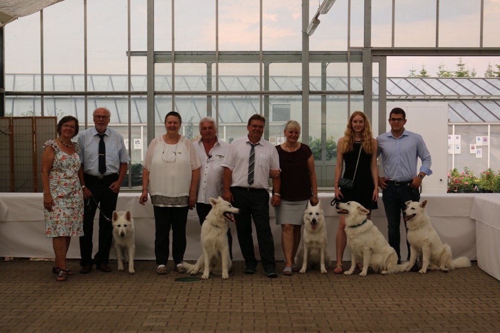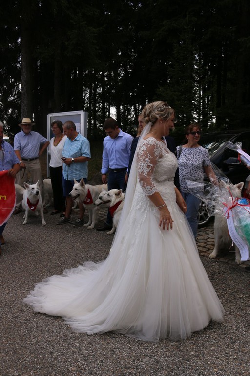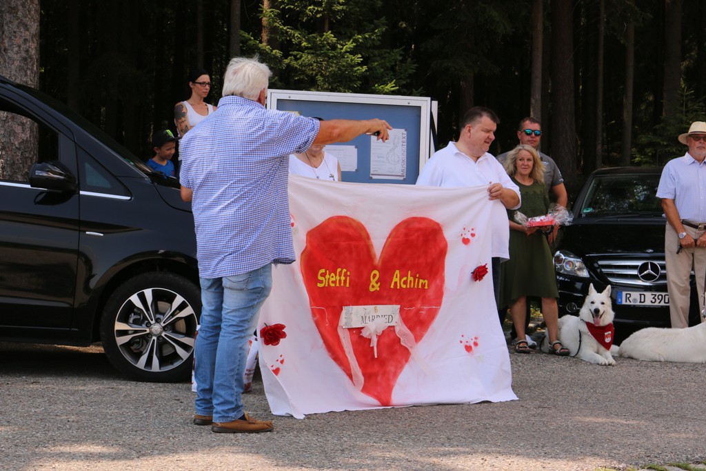 als sich am Samstag, den 4. August 2018 unsere Zwei, Steffi und Achim, das JA- Wort gaben. Sie hatten sich dazu die Steinwald-Kirche in Erbendorf ausgesucht, idyllisch auf einer Anhöhe im Wald gelegen. 17 Leinenführer und 14 Weiße Schweizer Schäferhunde und ein lieber Dackel ( welcher sich übrigens unter den „Weißen“ total wohl gefühlt hat )haben sich eingefunden.