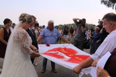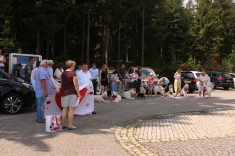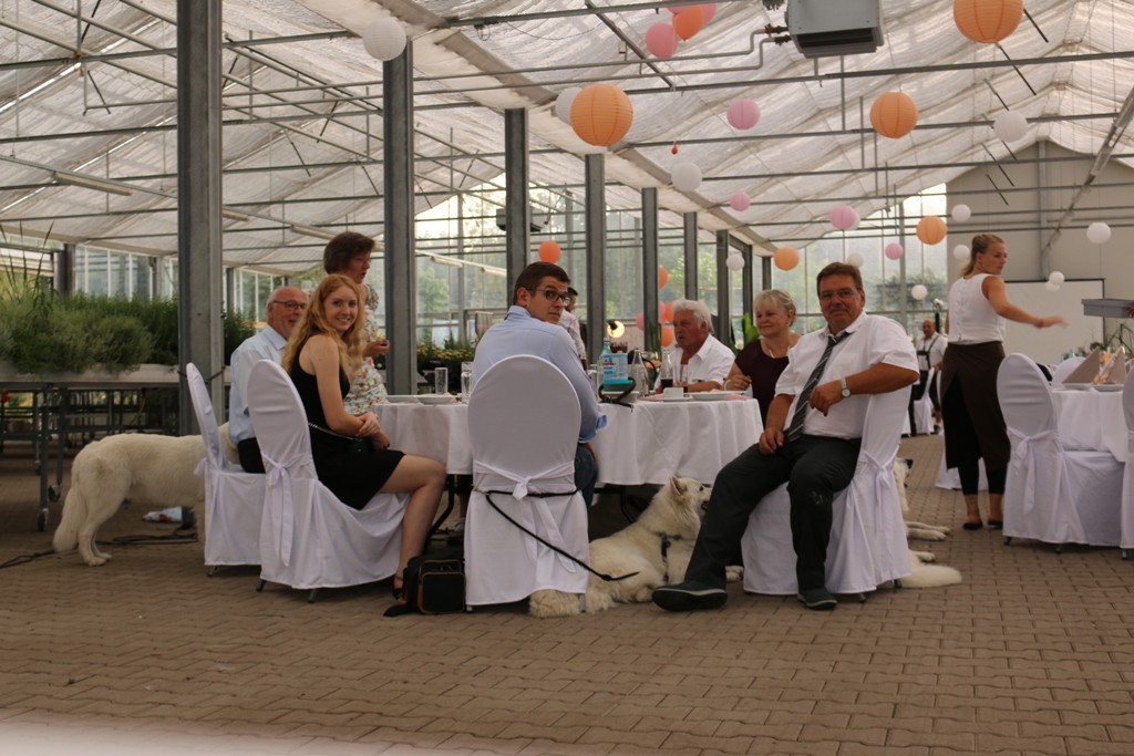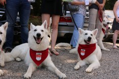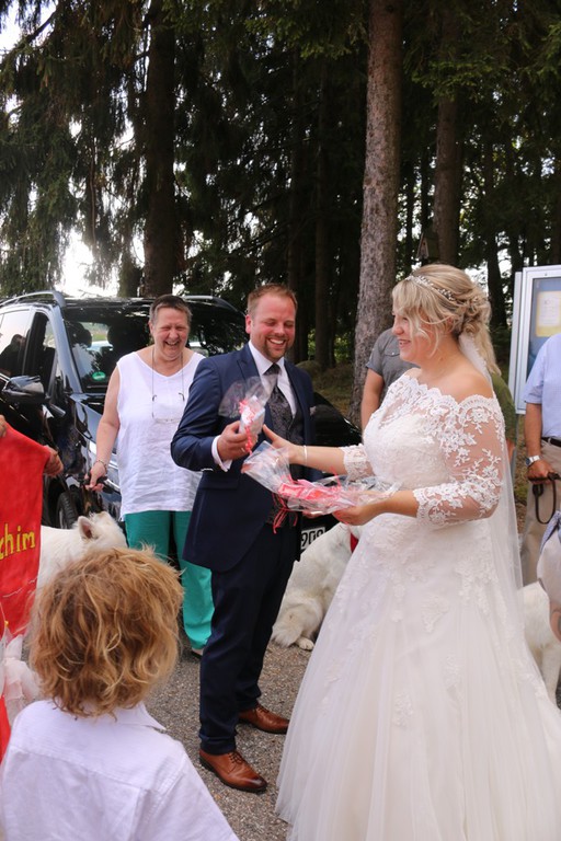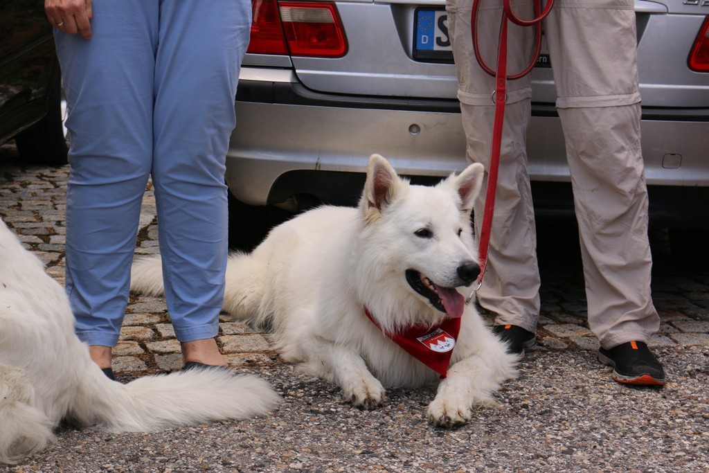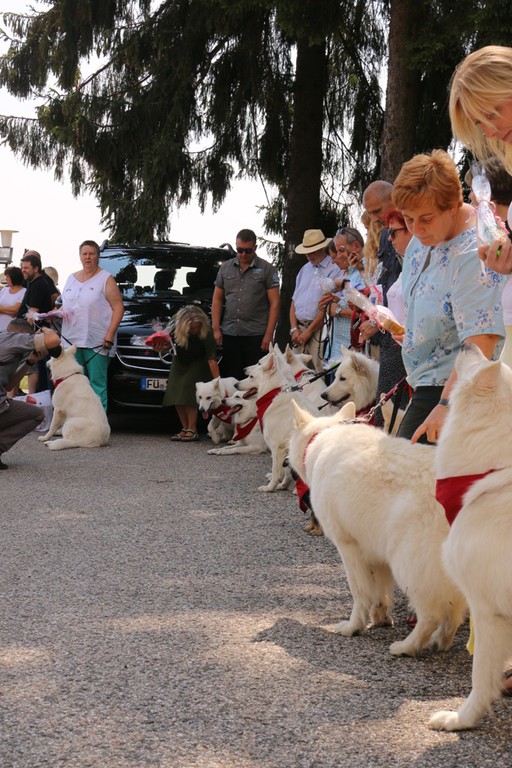 Das an Eisbären erinnernde Aussehen täuscht, sie zeigen auch bei Hochsommertemperaturen von weit über 30° ein „cooles“ Auftreten (im Gegensatz zu manchem Zweibeiner, dem die Hitze doch ordentlich zu schaffen machte). Mit selbstgenähten roten Halstüchern von Katja Michel für unsere Landesgruppe geschmückt saßen und warteten sie auf ihren Einsatz, der da hieß: Spalier stehen, wenn das Brautpaar aus der Kirche kommt.