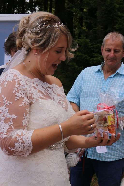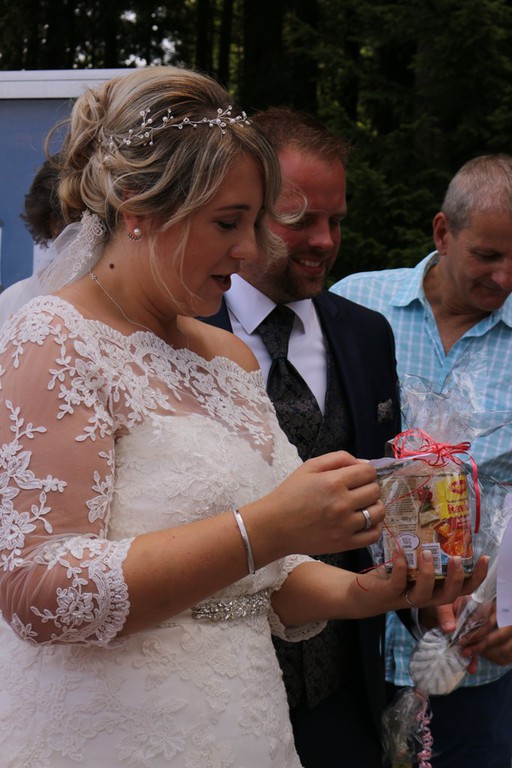 Nebenbei hatten sich die Spaliersteher mit den Hunden zu einem großen U aufgestellt. Jeder hatte ein Geschenk mit einem witzigen Spruch bereit.