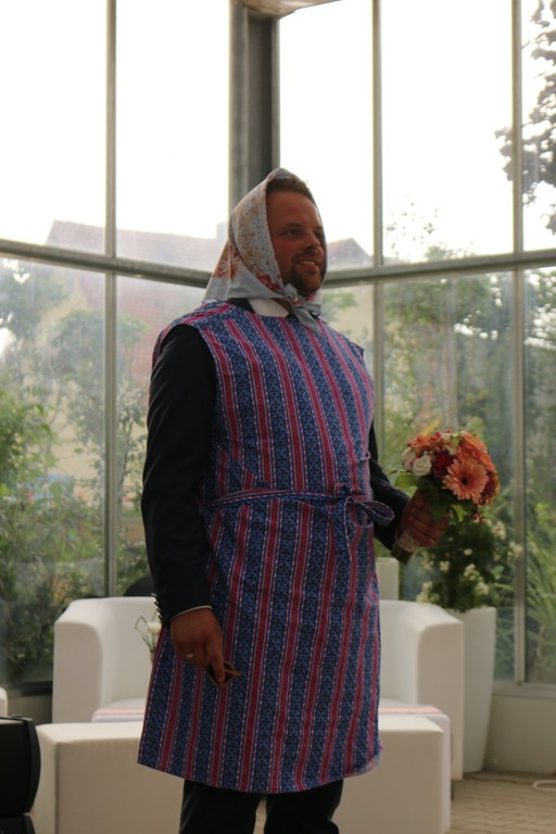 In Kittelschürze und Kopftuch und einem Blumenstrauß in der Hand musste er auf einem Holzscheit knien und Steffi inständig anflehen und darum bitten,