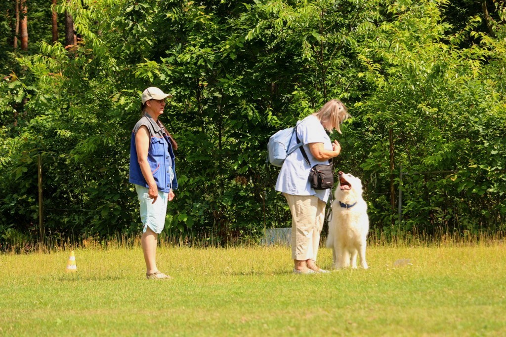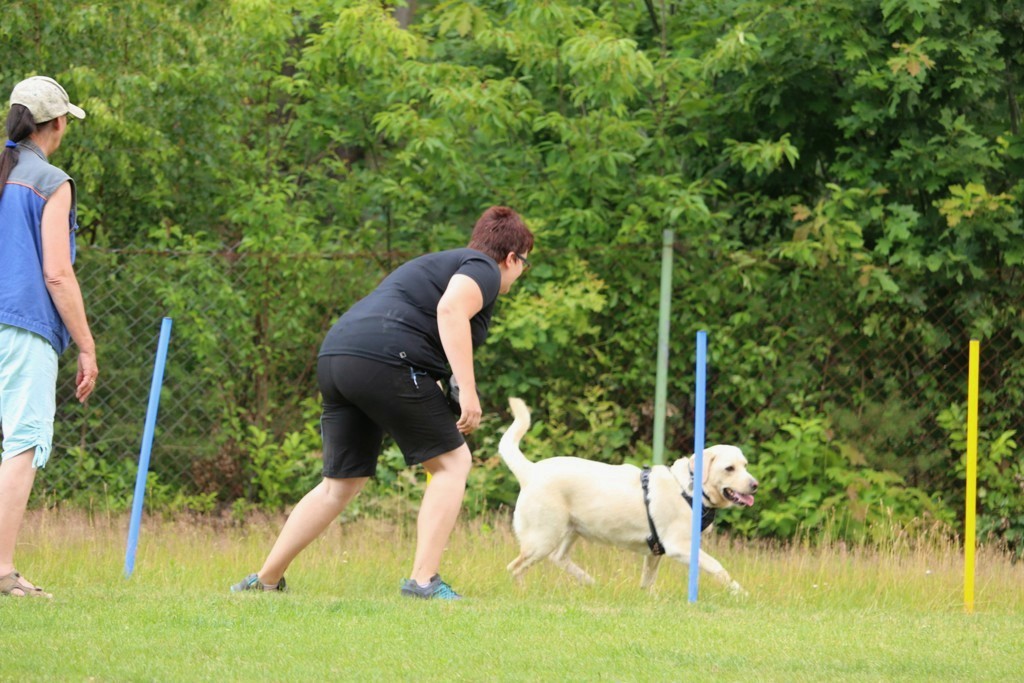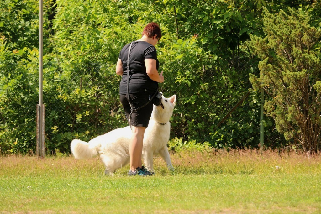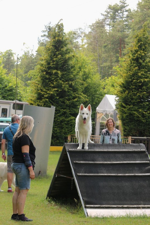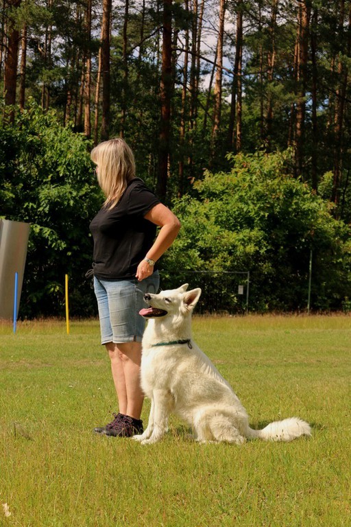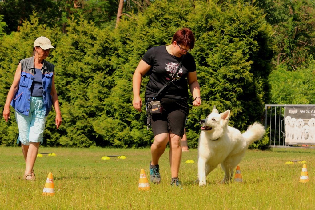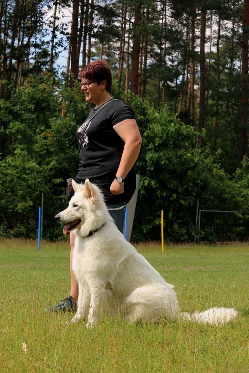So angenehm kühl und unterhaltsam es unterm Zeltdach auch war, wir wollten mit unseren Hunden auch arbeiten. Also! Auf geht’s! Ortswechsel, nur ein paar Meter, zum Trainingsplatz rüber! Dort war von fleißigen Helfern schon alles vorbereitet: ein kleiner Parcours für Agility, Geräte für Cavaletti-Training und einige Stationen für Obedience.
