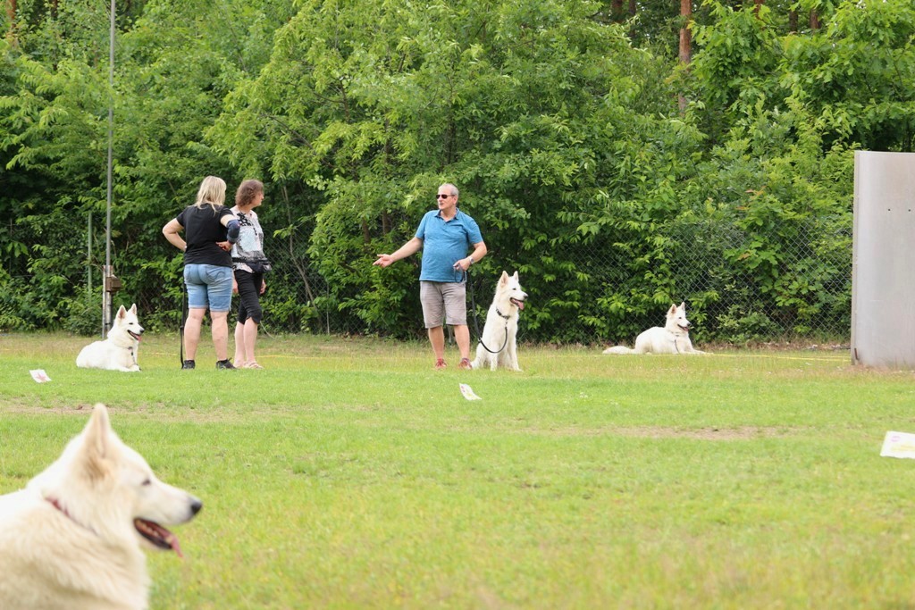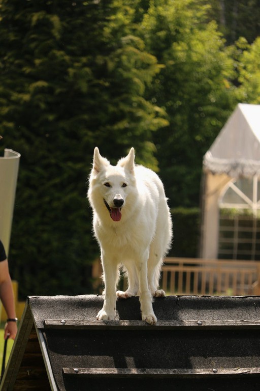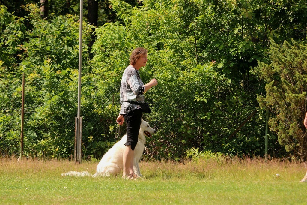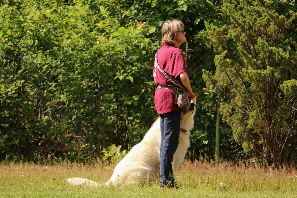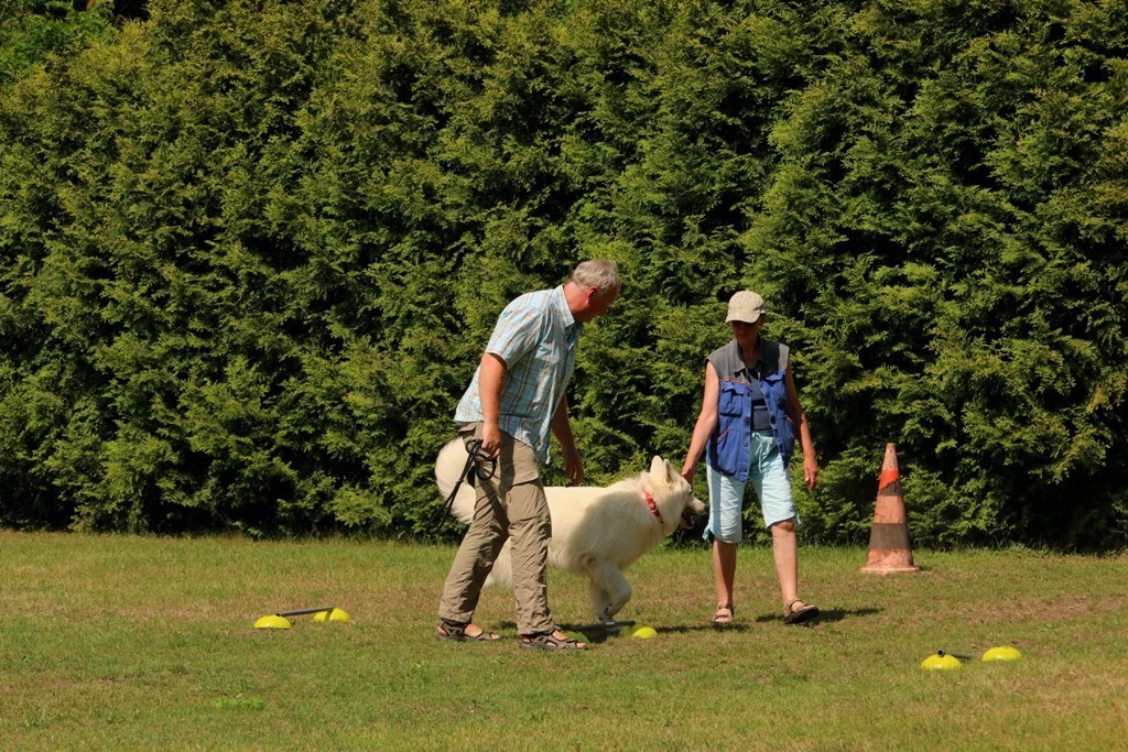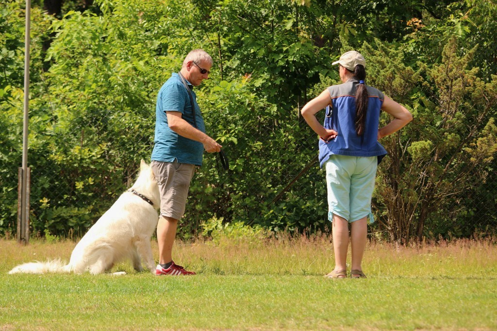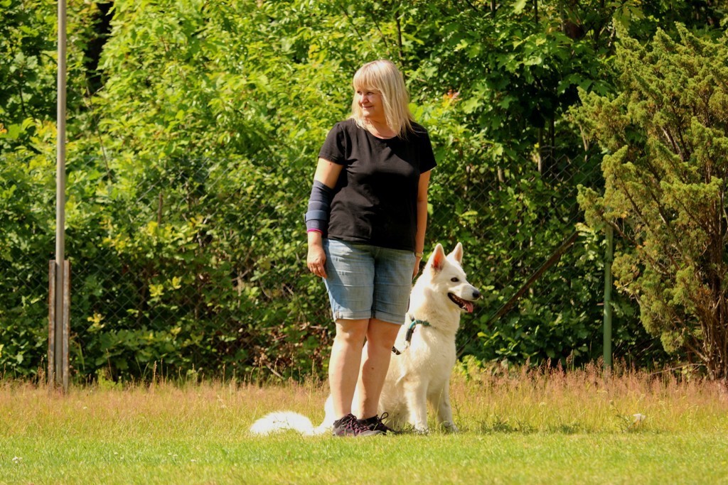 So angenehm kühl und unterhaltsam es unterm Zeltdach auch war, wir wollten mit unseren Hunden auch arbeiten. Also! Auf geht’s! Ortswechsel, nur ein paar Meter, zum Trainingsplatz rüber! Dort war von fleißigen Helfern schon alles vorbereitet: ein kleiner Parcours für Agility, Geräte für Cavaletti-Training und einige Stationen für Obedience.