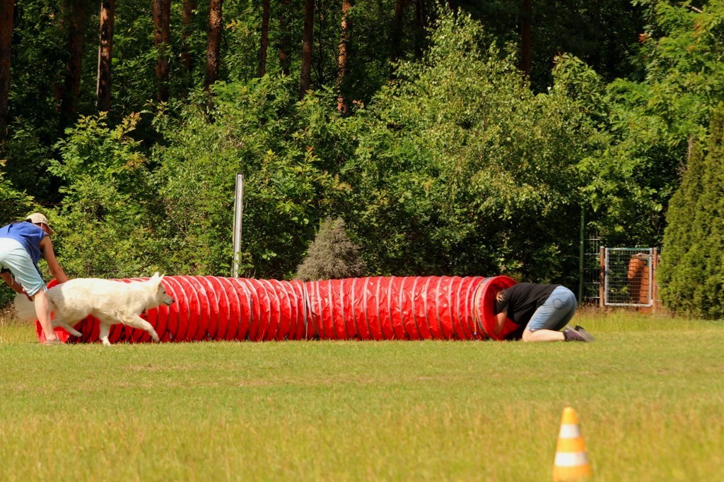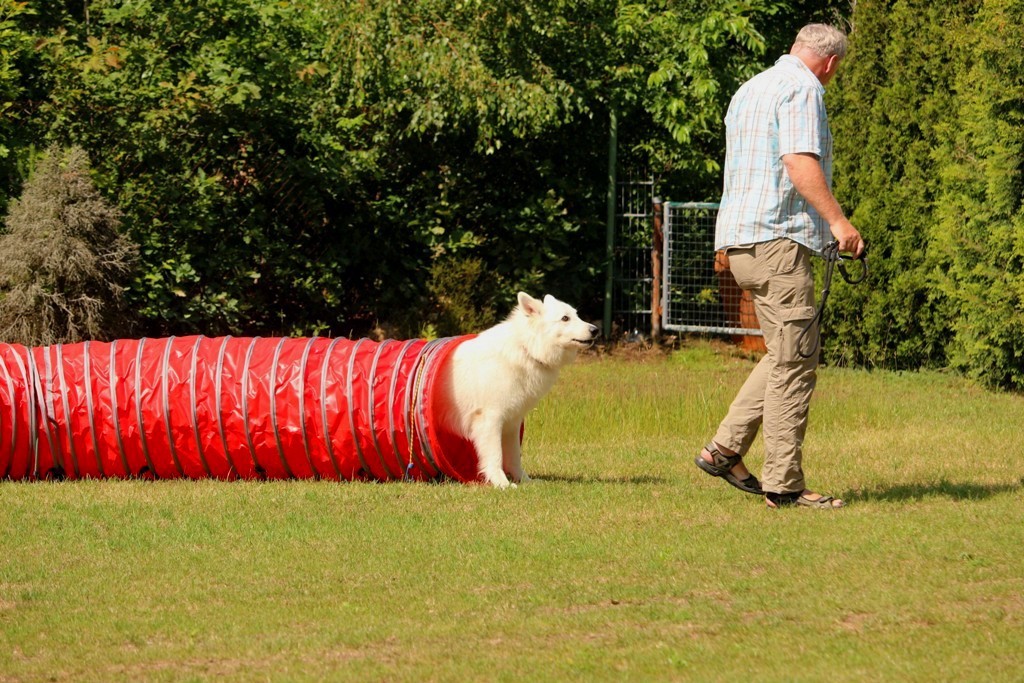 Zuerst machten sich alle mit dem Agility Parcours vertraut. Manche Hunde, die das schon kannten, meisterten die Hindernisse ohne Probleme, Hunde, für die das „Neuland“ war, wurden behutsam an die Bewältigung der Geräte herangeführt. So schafften es auch alle einen Slalom zu laufen. Für Heiterkeit sorgte die Station mit dem Tunnel! „Alte Hasen“ flitzten einfach durch, Neulinge wunderten sich, was das Ding auf der Wiese sollte. Sie schauten interessiert in den Tunnel rein, aber postwendend ging’s rückwärts gleich wieder raus.