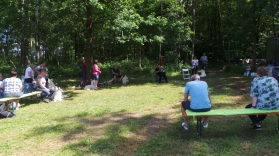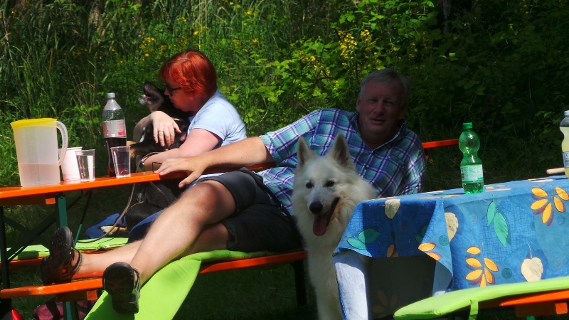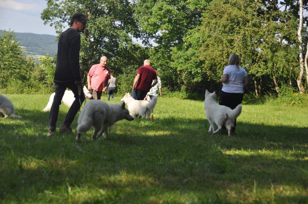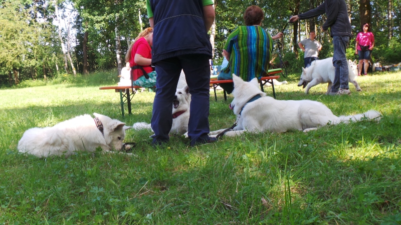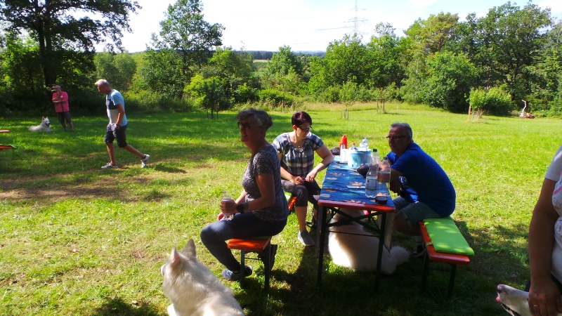 Trotzdem, dass uns noch immer Corona das Leben in Franken schwer macht, haben wir es gewagt, mit einem gut durchdachten Hygienekonzept, uns mal wieder zu treffen. Irene und Werner Langguth haben eingeladen und so trafen sich 29 Leinenhalter und 21 Vierbeiner. Das Wetter war perfekt, nicht zu heiß, nicht zu kalt und trocken. Zunächst sammelten wir uns beim Wohnhaus der Familie Langguth und wanderten dann zum Waldgrundstück wo bereits alles vorbereitet war. Wir konnten im Schatten der Bäume sitzen, natürlich mit Abstand (die meisten bereits gegen Corona geimpft, die anderen hatten einen negativen Test vorgewiesen). Nach einer Begrüßung von Irene Langguth und Katja Michel, unserer ersten Vorsitzenden, gab es leckeren Leberkäs' und ein reichhaltiges Salatbuffet, es war für jeden was dabei.