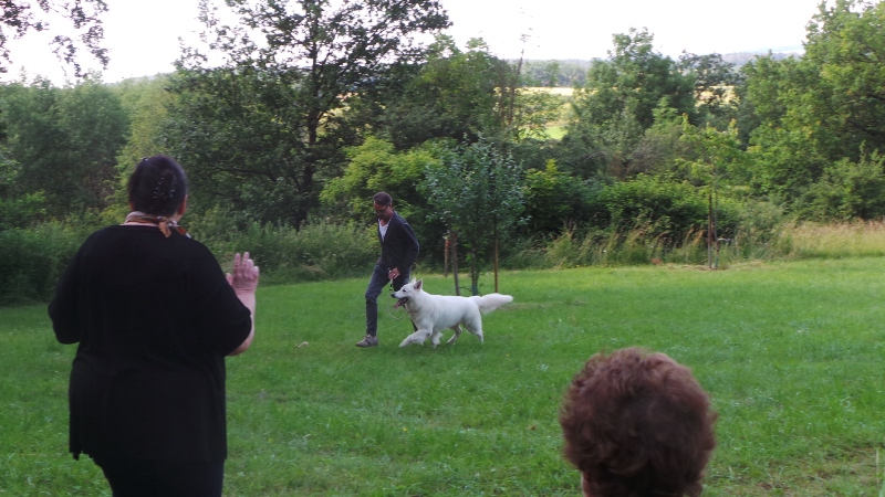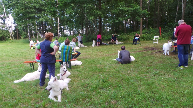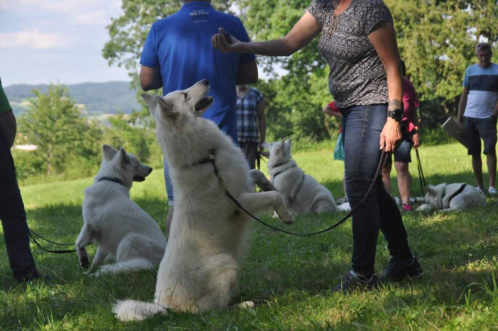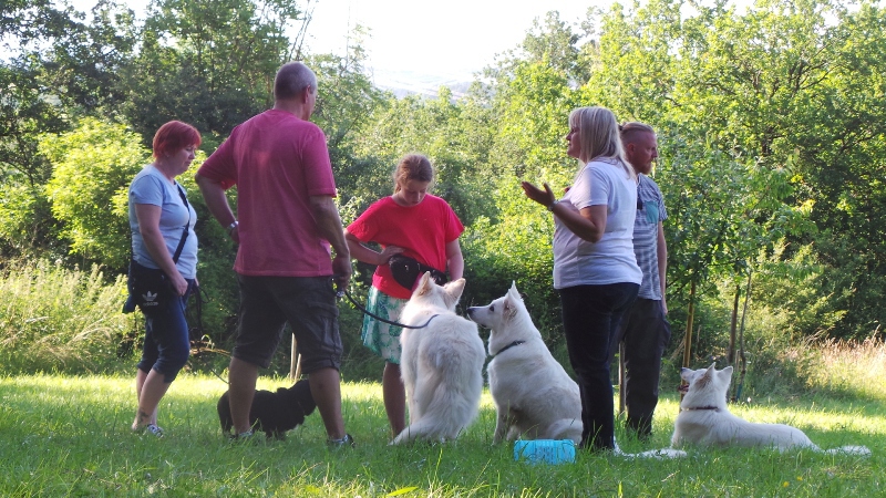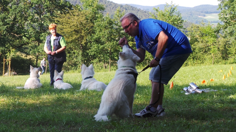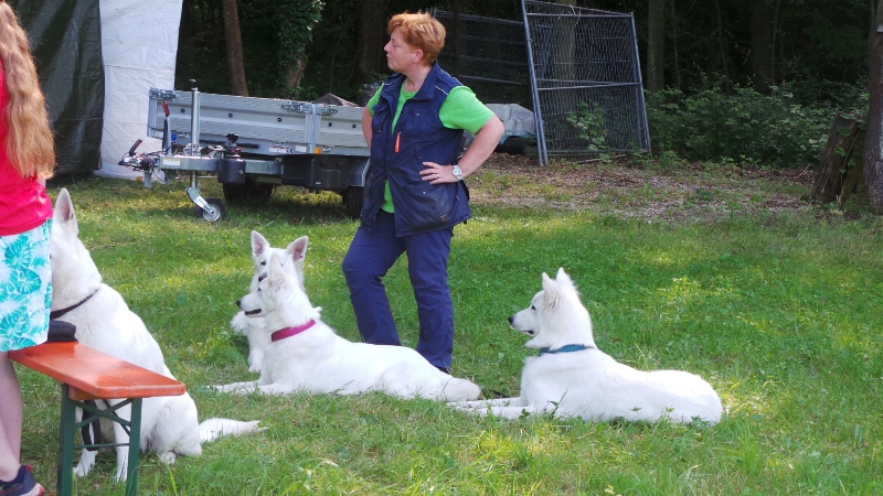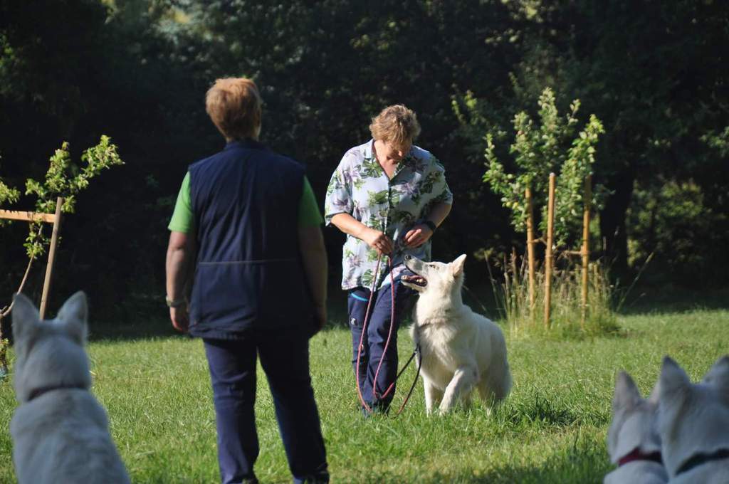 Danach hatte der Ehrengast des Treffens etwas für uns vorbereitet. Yasmine Richter die bereits einige Ausstellungen unserer Weißen gerichtet hatte und viel Erfahrung mitbrachte, informierte uns worauf es ankommt. Zum einen über die Ausstellung selbst, die verschiedenen Klassen, die Titel, was man alles dabei haben sollte... Auch die Profis konnten hier noch etwas lernen. Sie unterstützte uns dann beim Ringtraining und erklärte sehr ausführlich auf was ein/e Richter/in so alles achtet. Sie gab uns viele Tipps: wie läuft man richtig, wie läuft der Hund richtig, wie trainiert man das richtige Laufen, wie stellt man einen Hund korrekt, welche Hilfsmittel (Spielzeug, Leckerchen) darf man einsetzten, bzw. wie setzt man sie am besten ein. Jeder durfte mit seinem Hund probieren und sie ging auf jeden Hund ein.