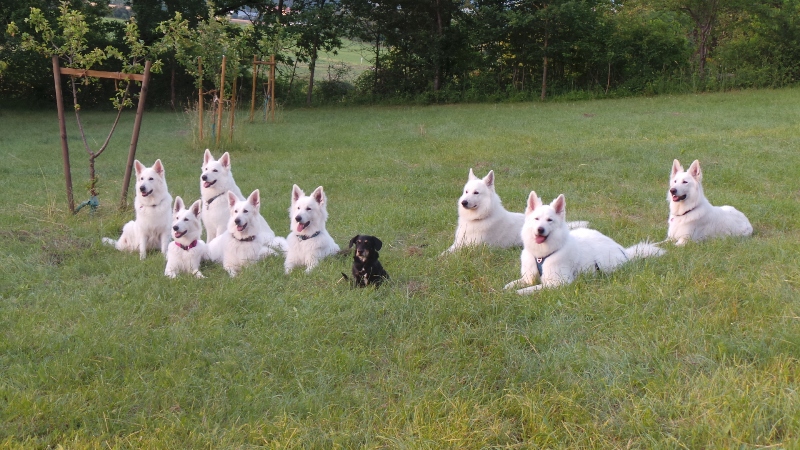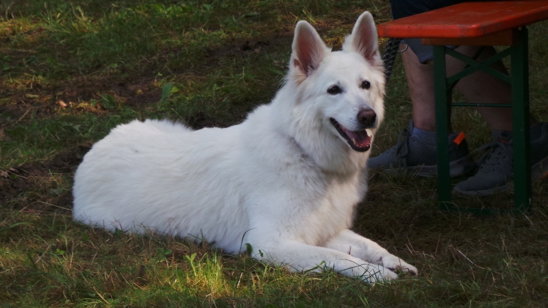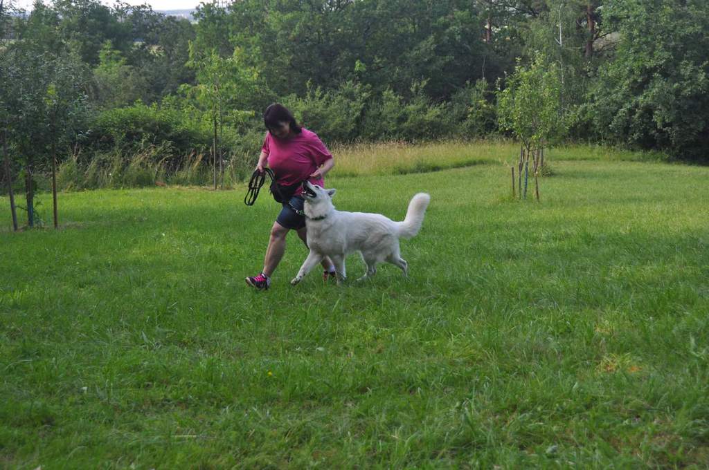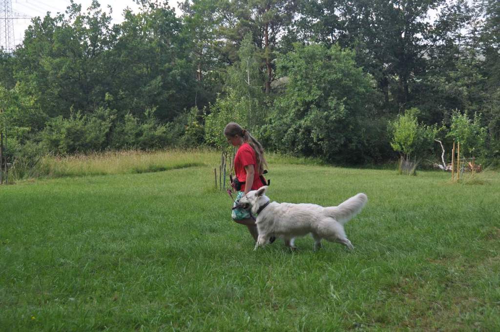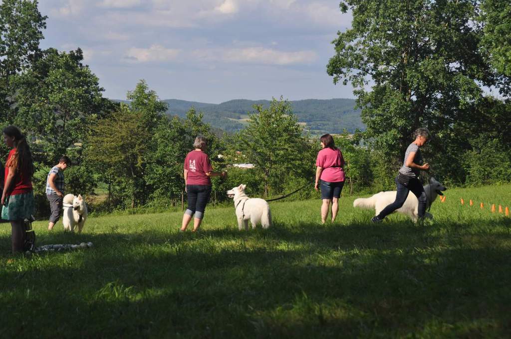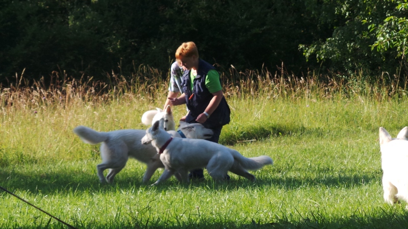 Danach hatte der Ehrengast des Treffens etwas für uns vorbereitet. Yasmine Richter die bereits einige Ausstellungen unserer Weißen gerichtet hatte und viel Erfahrung mitbrachte, informierte uns worauf es ankommt. Zum einen über die Ausstellung selbst, die verschiedenen Klassen, die Titel, was man alles dabei haben sollte... Auch die Profis konnten hier noch etwas lernen. Sie unterstützte uns dann beim Ringtraining und erklärte sehr ausführlich auf was ein/e Richter/in so alles achtet. Sie gab uns viele Tipps: wie läuft man richtig, wie läuft der Hund richtig, wie trainiert man das richtige Laufen, wie stellt man einen Hund korrekt, welche Hilfsmittel (Spielzeug, Leckerchen) darf man einsetzten, bzw. wie setzt man sie am besten ein. Jeder durfte mit seinem Hund probieren und sie ging auf jeden Hund ein.