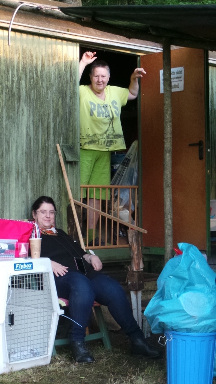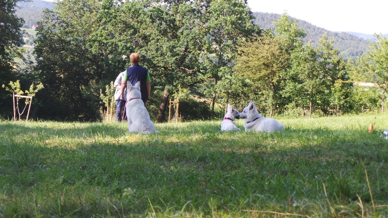 Aber das war natürlich noch nicht alles. Geplant ist ja im Herbst eventuell eine Zuchtzulassungsprüfung, auf die man sich ja auch vorher vorbereiten kann. Zu diesem Zweck hat unsere Sonja Pesak, die ja in der LG für Ausbildung und Sport zuständig ist, und Michael Ostermann einiges vorbereitet. Es gab Dosen die klappern, eine Ratsche, ein Schuß wurde simuliert,...