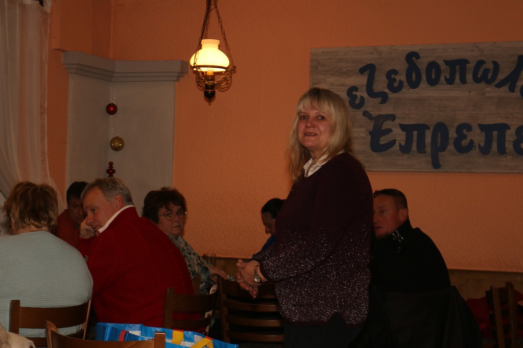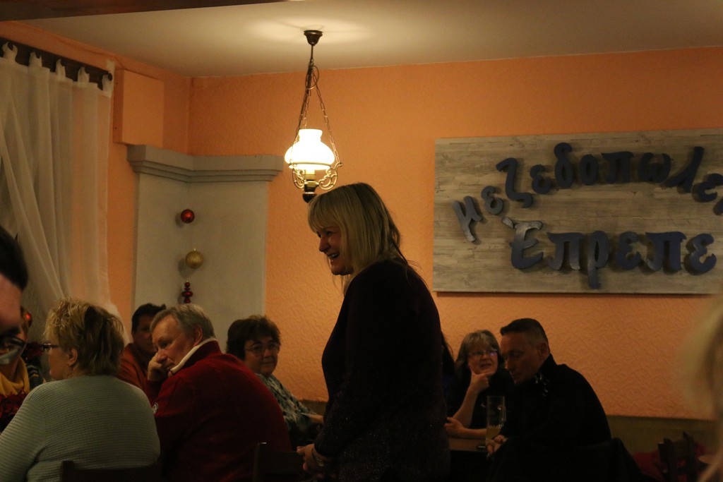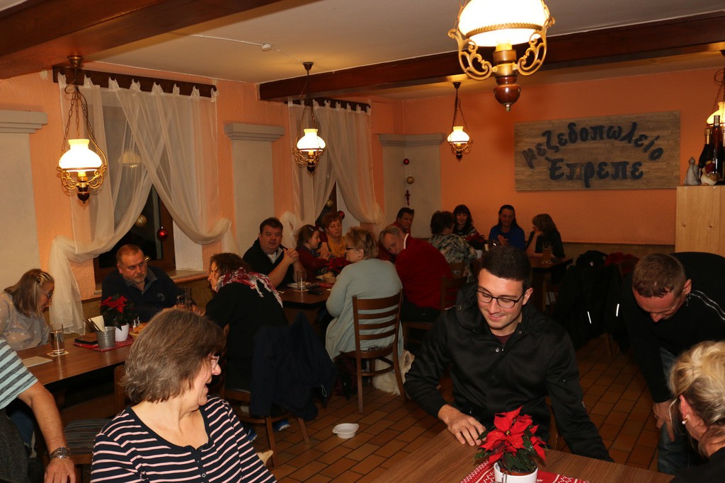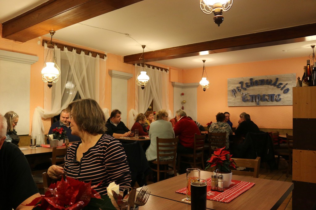 Gegen 18 Uhr war Aufbruch zum dritten Programmpunkt, der Fußmarsch zum Lokal, in dem wir den Abend verbrachten. Also Berg runter, über die Straße, Berg rauf, rechts weg und schon waren wir am Ziel, der Taverna Ela Mesa. „Unser“ Grieche erwartete uns schon vor dem Eingang und begrüßte jeden mit Handschlag! Es war ein herzlicher Empfang für uns und unsere Hunde, die dort nicht nur geduldet, sondern herzlich willkommen sind! Die reichhaltige Speisekarte ließ keine Wünsche offen.